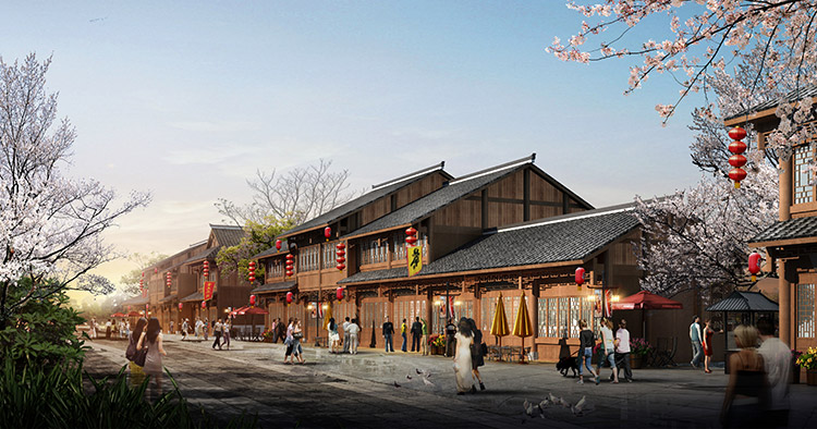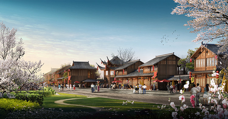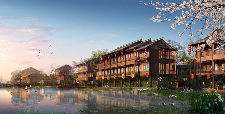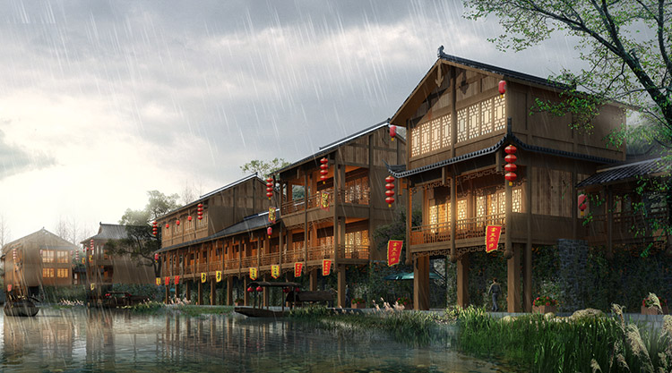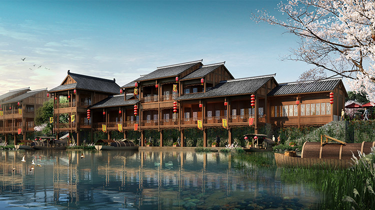 栗河吊腳樓沿河呈狹長不規(guī)則帶狀,南北向進深約25m,東西向?qū)捈s527m。項目占地面積12486.41平米(18.73畝),總建筑面積4520.87平米,分為A至J十個單體建筑,建筑層數(shù)1~2層,門面商鋪45間,沿河道均勻分布。建筑依據(jù)場地,與南側(cè)道路平行布置,建筑主入口面向場地南側(cè)道路,建筑沿河布局,底部1層為架空空間,其上為主體建筑,建筑整體風格風貌為仿明清時代,外觀簡潔、大方,給人以明朗、周正的空間體驗。契合時代新形象,尺度更為親切。場地內(nèi)部景觀主要由硬質(zhì)景觀與軟質(zhì)景觀共同構(gòu)成。硬質(zhì)景觀主要包括廣場、步道和活動場地,軟質(zhì)景觀主要是綠化種植。